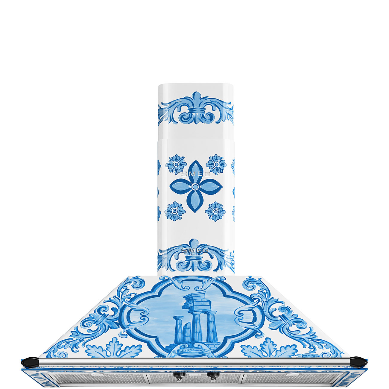 Digestor Smeg Victoria KT90DGM Dolce&Gabbana v špeciálnom majolikovom dizajne s lesklým povrchom prináša do kuchyne jedinečný štýl. S komínovým dizajnom a spoluprácou s Dolce&Gabbana dodáva eleganciu a šarm.